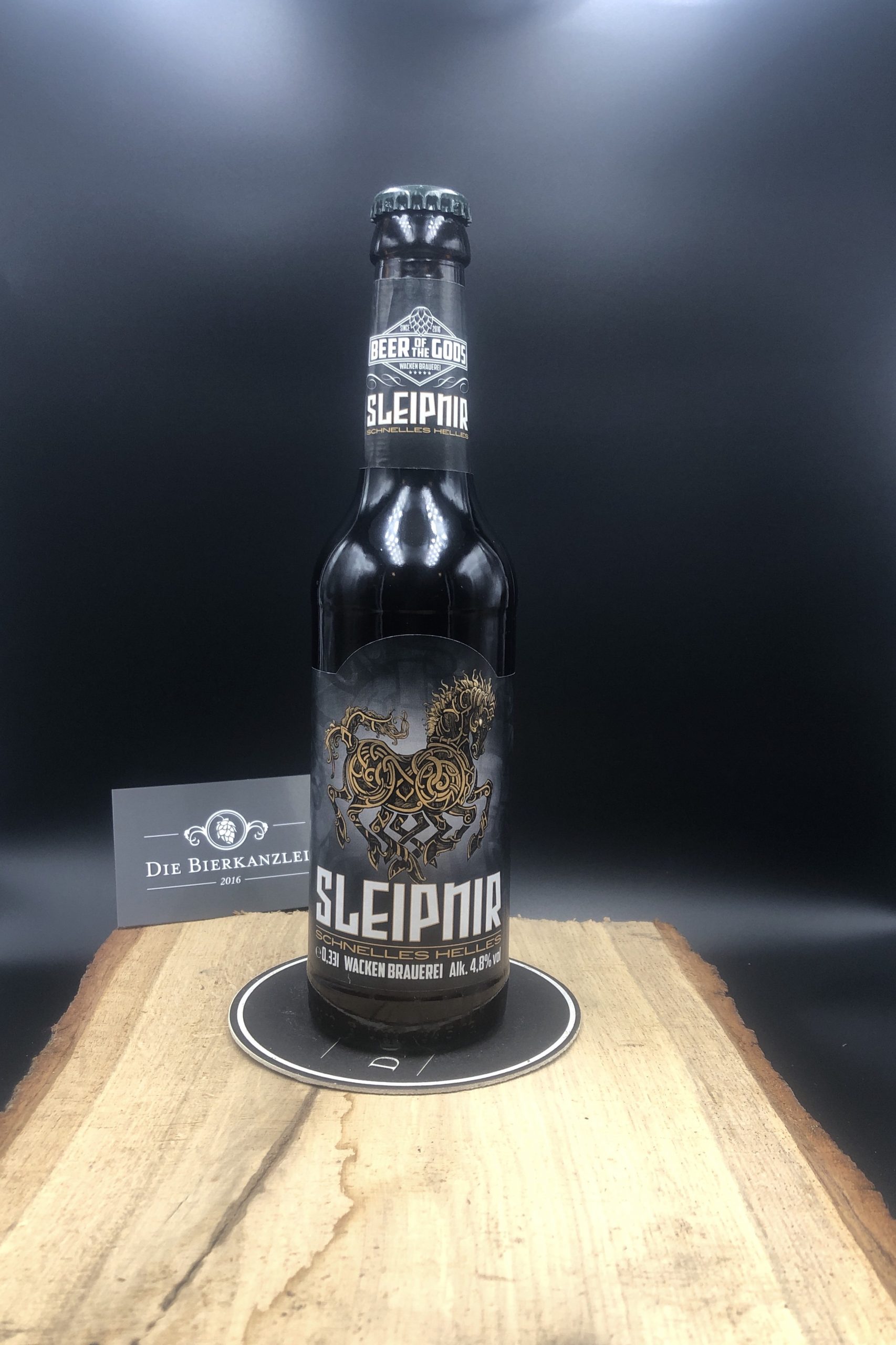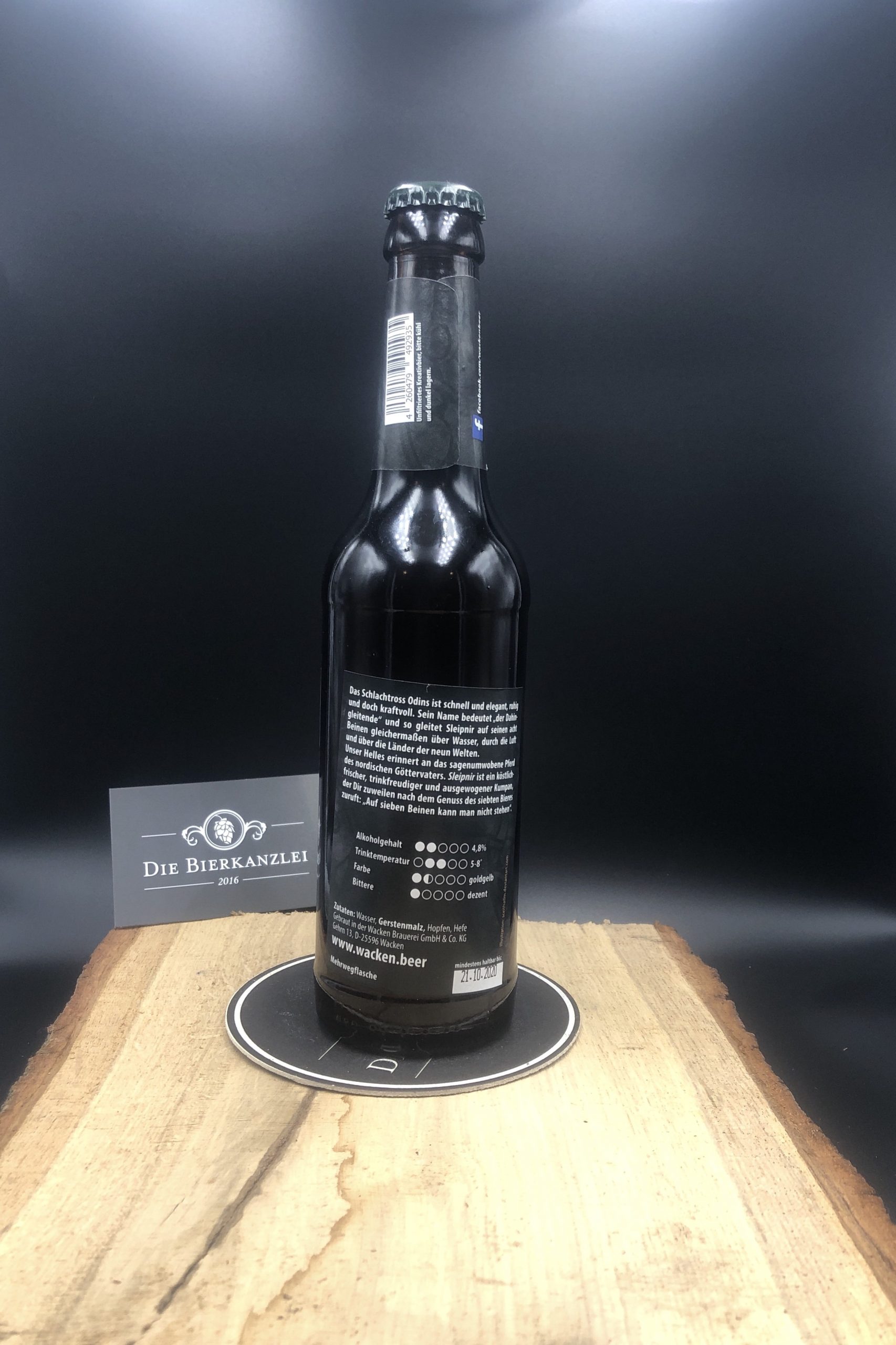 Wacken Sleipnir Schnelles Helles. Das Schlachtross Odins ist schnell und elegant, ruhig und doch kraftvoll. Sein Name bedeutet: „der Dahingleitende“ und so gleitet Sleipnir, den Allvater im Sattel, auf seinen acht Beinen gleichermaßen über Wasser, durch die Luft und über die Länder der neun Welten. Dieses Helle erinnert an das sagenumwobene Pferd des nordischen Göttervaters. Sein (feier)abendlicher Genuss ist ein Dahingleiten über die Geschehnisse des Tages. Sleipnir ist ein köstlich-frischer, trinkfreudiger und ausgewogener Kumpan, der Dir zuweilen nach dem Genuss des siebten Bieres zuruft: „Auf sieben Beinen kann man nicht stehen“. Sleipnir ist klassisch gebraut nach Münchner Rezeptur, mit Hand, Herz und Wasser aus Wacken, verfeinert mit den Aromahopfen Saphir und Celeia. Ein treffliches Gebräu. Im Galopp rinnt es die Kehle hinab: Skál!